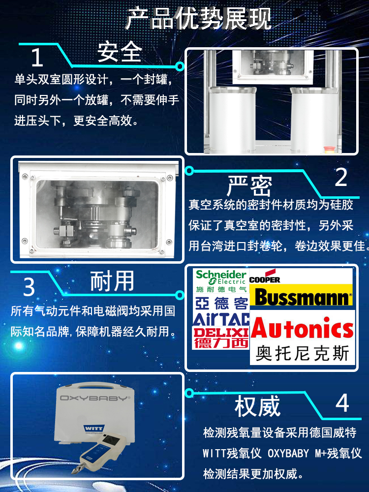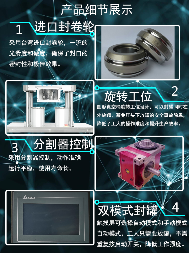 本設(shè)備采用單個(gè)封口(kǒu)頭,雙工作室旋轉封口,一個工作室封口的時候,另(lìng)一(yī)個工作室可以放罐子,讓(ràng)操作更安全和快捷.
